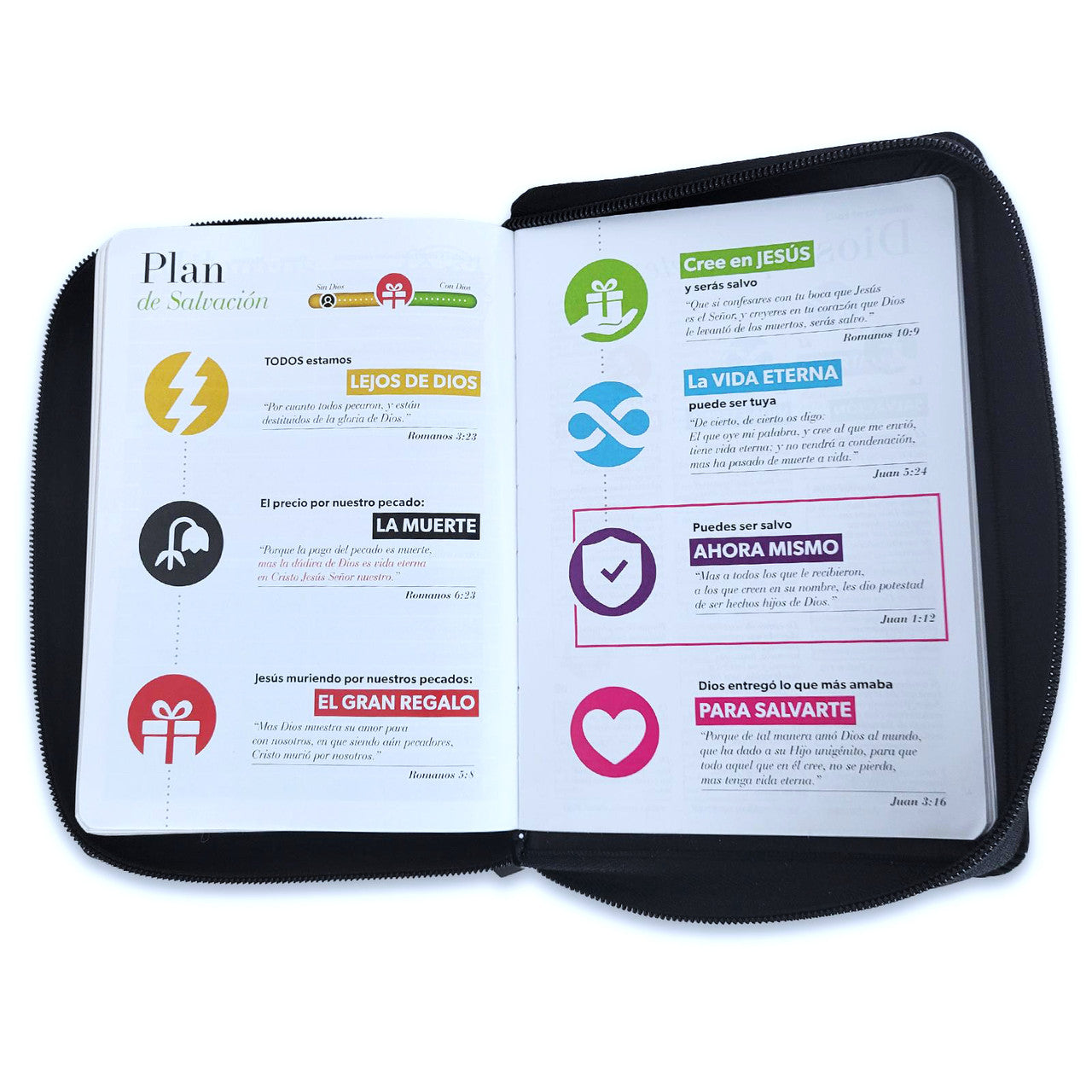 The Reina-Valera 1960 translation type is one of formal equivalence, all this without altering the basic sense of the biblical message and also preserving the style and cadence of the Reina text. This is the version most accepted by all the churches in Latin America and Spain. This edition of the Bible in Reina Valera 1960 is ideal for those who want a Bible with legible 11-point font in a compact size. It contains 32 full-color pages with help.