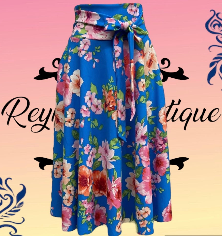 Floral skirt with ribbon, 3/4 length below the knee. The floral print gives it a touch of freshness and the ribbon adds a feminine detail. Perfect for any casual or formal occasion.
