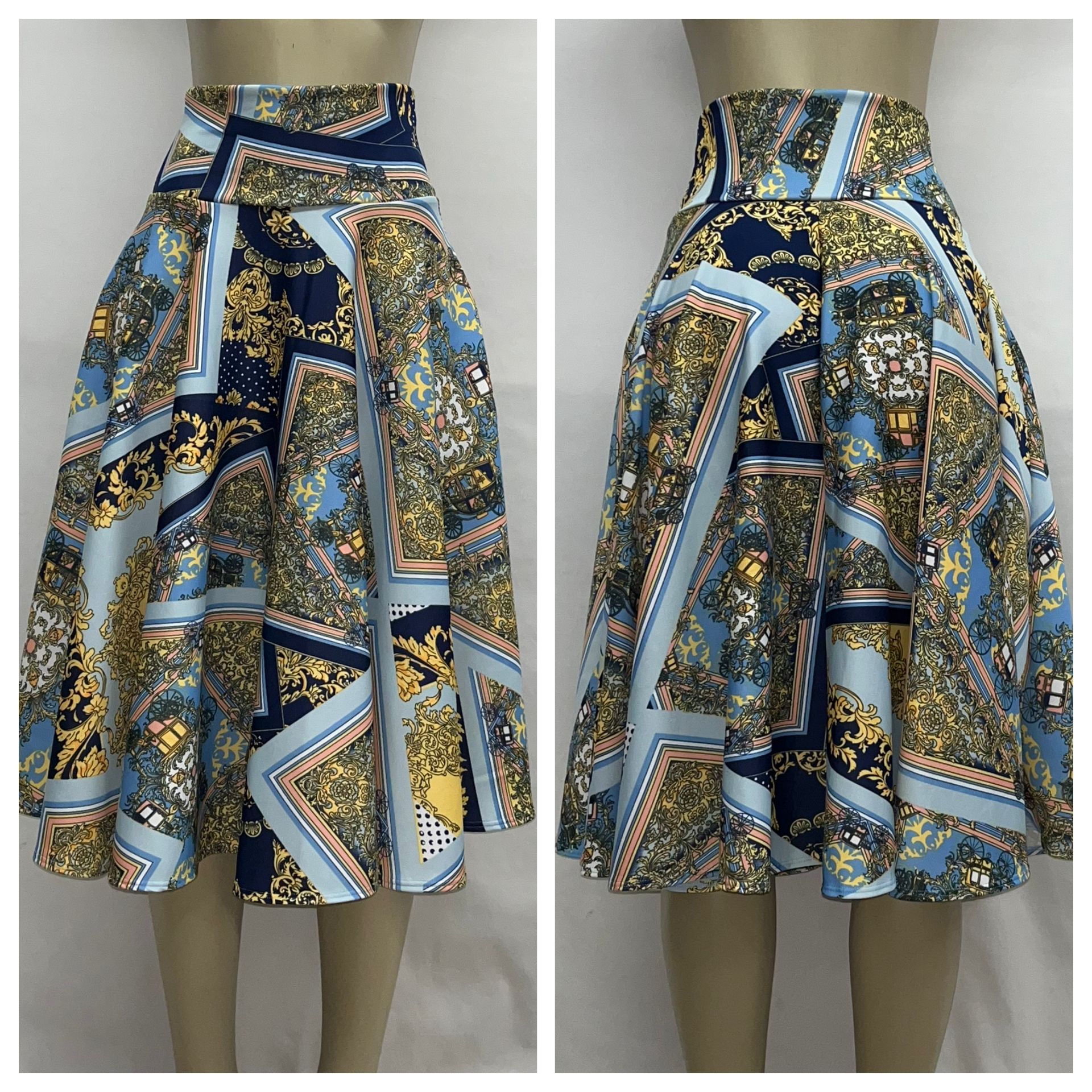🖼️ Estampado: Tipo pañuelo con motivos barrocos en azul, dorado y celeste
