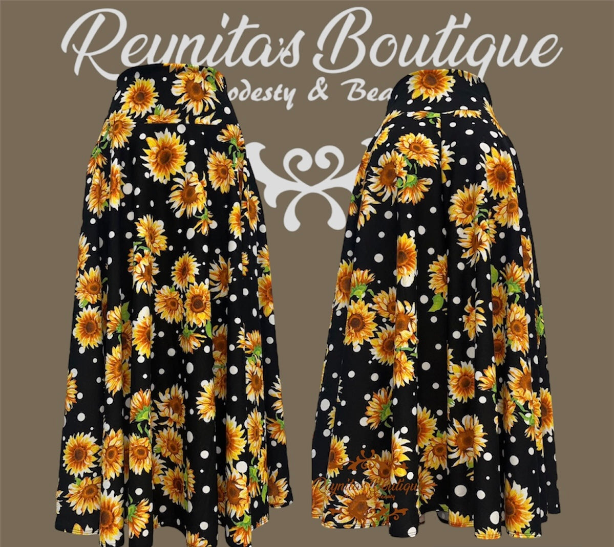 Discover your bolder side with our full disco skirt in black with beautiful sunflowers. Made in a long and elegant design, this skirt is the perfect option for a sophisticated and exclusive look. Dare to shine with its sunflower print and become the center of attention.
