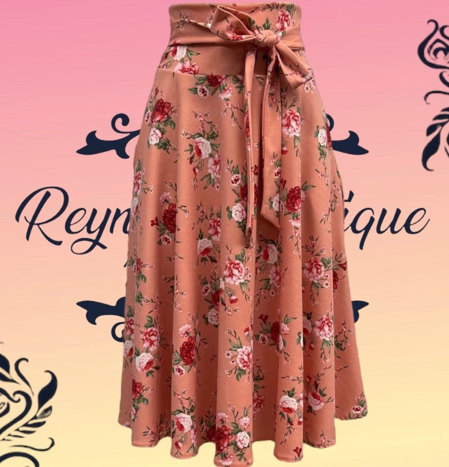 Floral skirt with ribbon, 3/4 length below the knee. The floral print gives it a touch of freshness and the ribbon adds a feminine detail. Perfect for any casual or formal occasion.