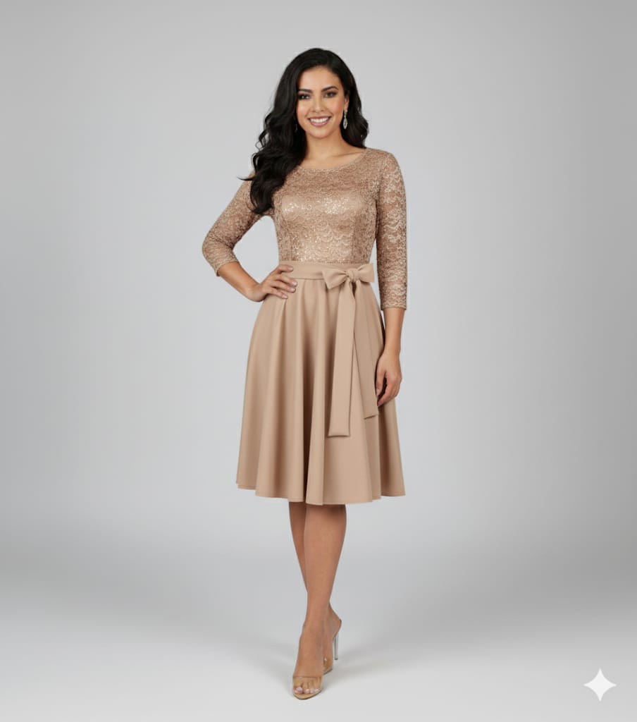Elegant party dress with lace and sequin details, embellished with a ribbon for a touch of glamour. Perfect for any special occasion. Look sophisticated and fashionable with this party dress.