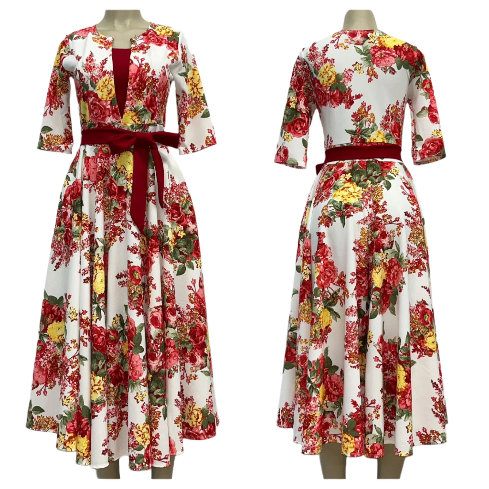 Estampado: Floral multicolor (rosas, peonías y flores silvestres en tonos rosa, amarillo, blanco y verde)