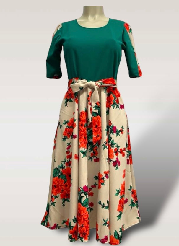 This floral dress comes with a beautiful ribbon and practical pockets. Perfect for any occasion thanks to its versatility and comfort. Enjoy a feminine and convenient style with this dress.