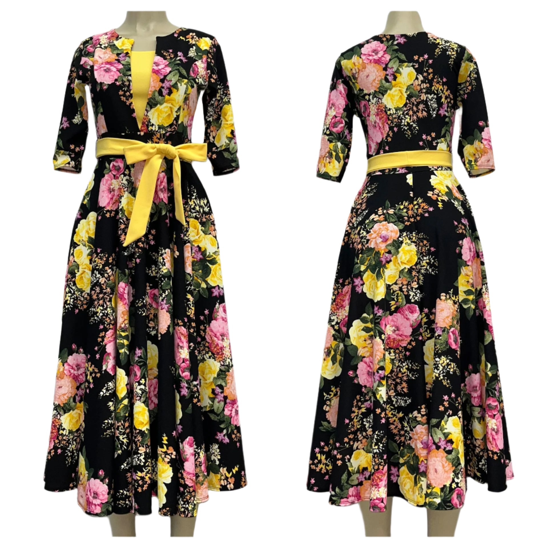 Estampado: Floral multicolor (rosas, peonías y flores silvestres en tonos rosa, amarillo, blanco y verde)