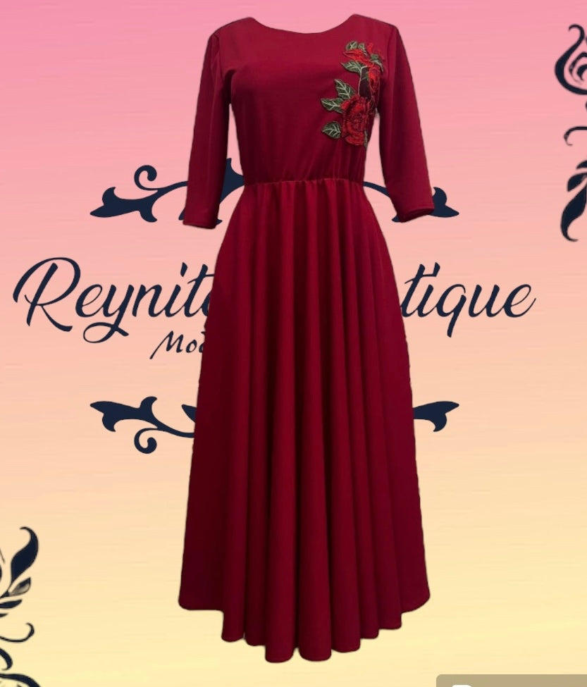 Long dress with a front rose design. This dress features pockets for added convenience. Perfect for showing off an elegant and feminine look with a floral touch.