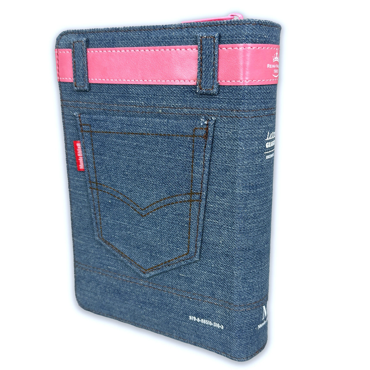Biblia Tela Jean con Cierre Compacta 11 puntos RV1960 cinturón rosado con índice