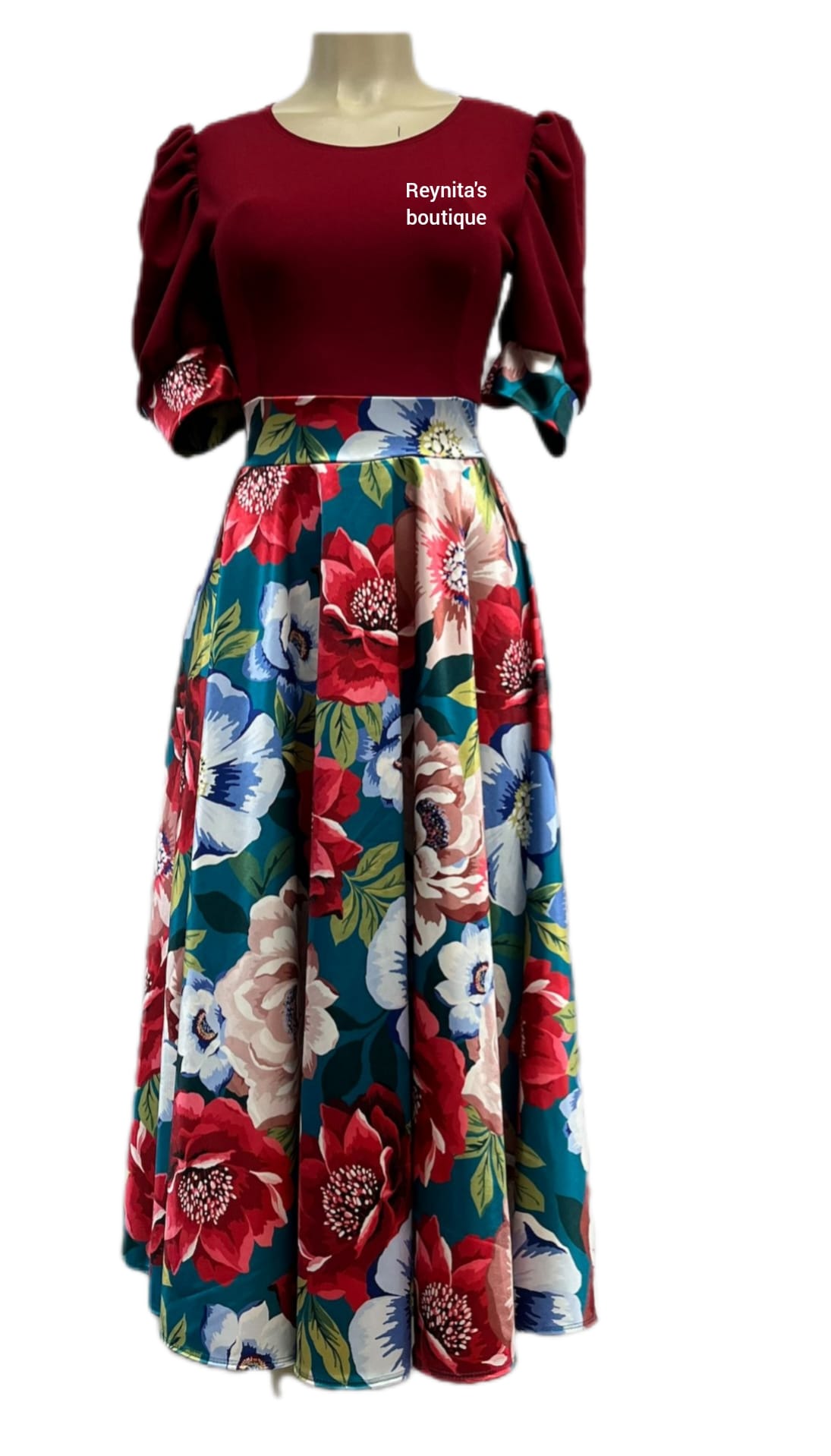 🌸 Falda: De disco completo, amplia y con movimiento envolvente; decorada con estampado floral multicolor