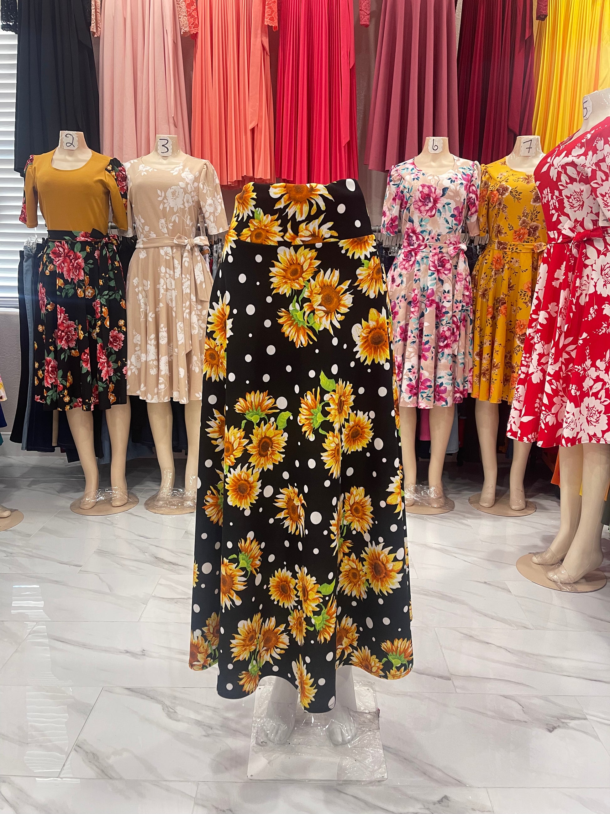 Esta falda medio disco larga es cómoda y bonita. Perfecta para cualquier ocasión, su tela suave te hará sentir bien durante todo el día. Además, su hermoso diseño con girasoles te hará destacar en cualquier lugar.