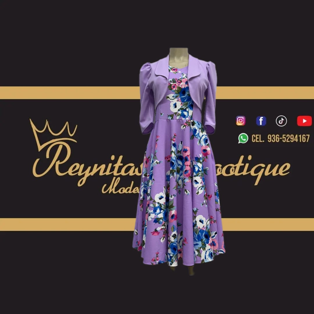 Este encantador vestido confeccionado en suave tela tecnocrêpe combina elegancia clásica con frescura floral. Su diseño en tono lila, adornado con un vibrante estampado de flores en tonos azul, blanco y rosa, aporta un aire romántico y femenino ideal para cualquier ocasión especial.