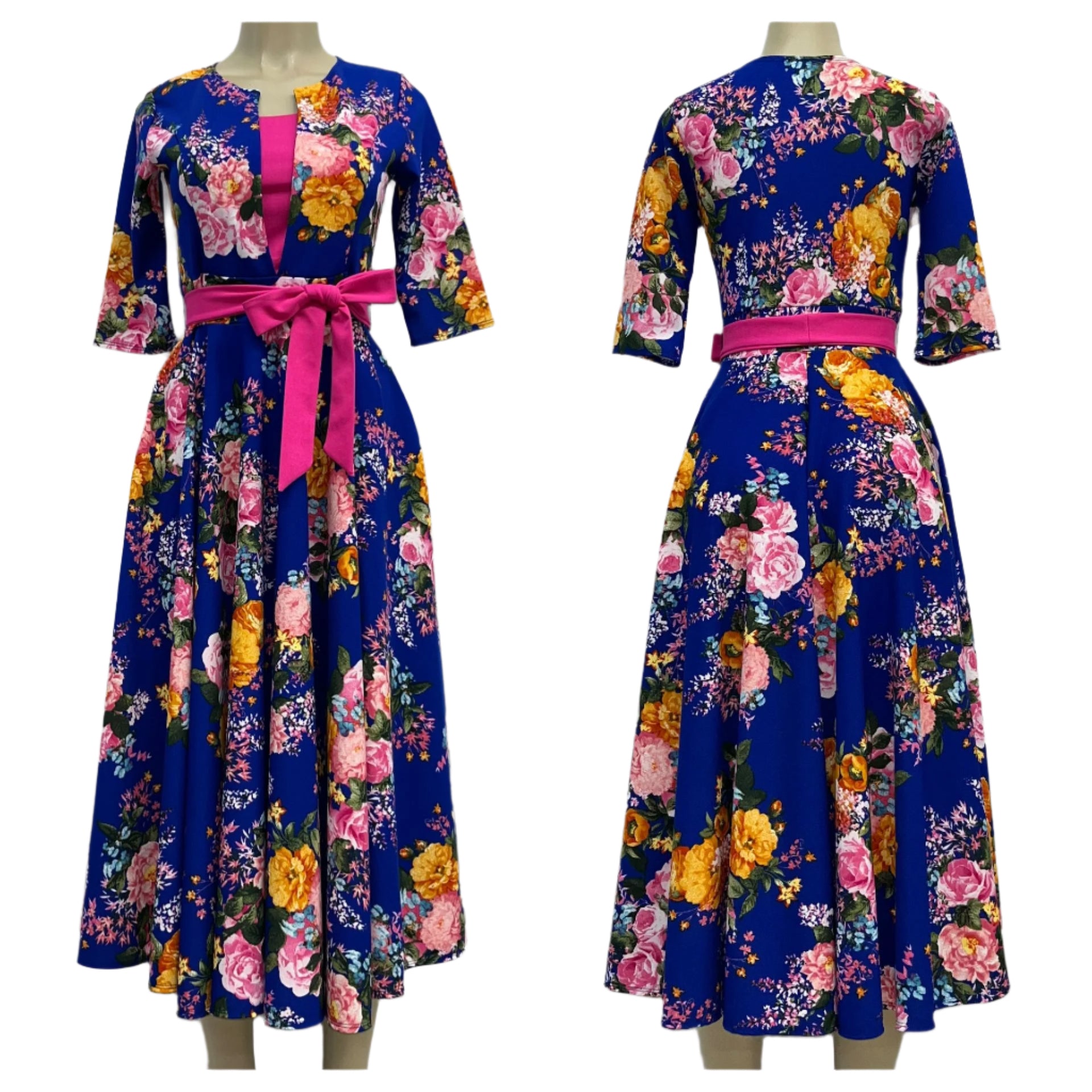Toque especial: Contraste vibrante entre el fondo azul y el cinturón fucsia, que realza la silueta