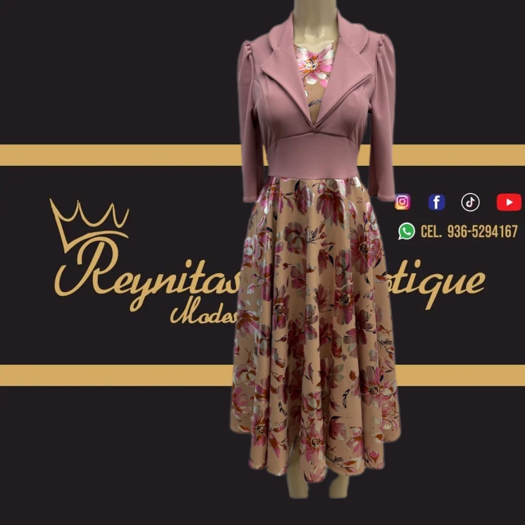 * 🧥 **Parte superior:** Color rosa palo con cuello tipo saco y mangas 3/4 con ligero fruncido en los hombros.