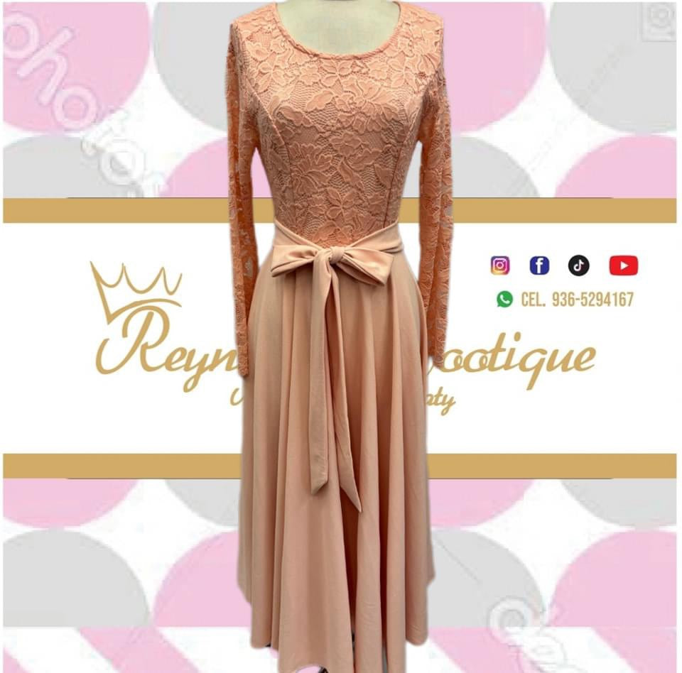 Este vestido liso de blonda es una opción sofisticada para cualquier ocasión. Presenta el detalle de un listón que realza la figura, mientras que su diseño plisado y manga larga aportan elegancia y comodidad. ¡Luce espectacular con este vestido!