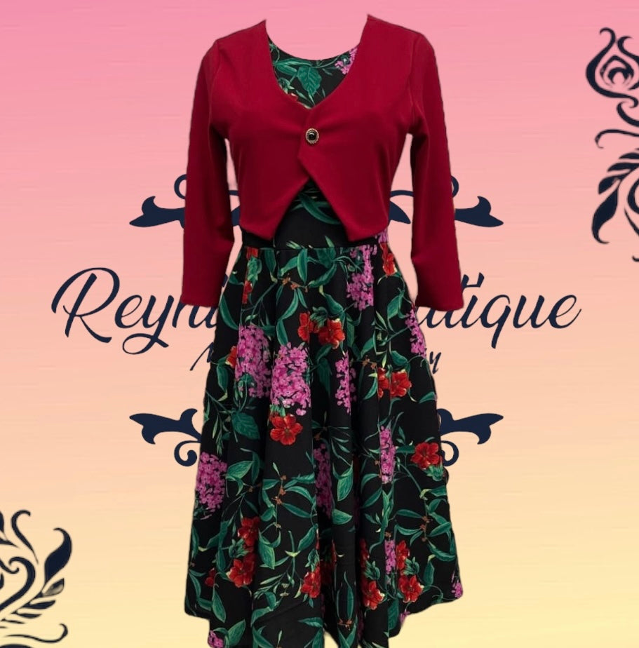 Vestido con flores y chaleco. El vestido cuenta con chaleco y bolsillos, ofreciendo comodidad y estilo. Perfecto para cualquier ocasión, este conjunto es una elección elegante y práctica.