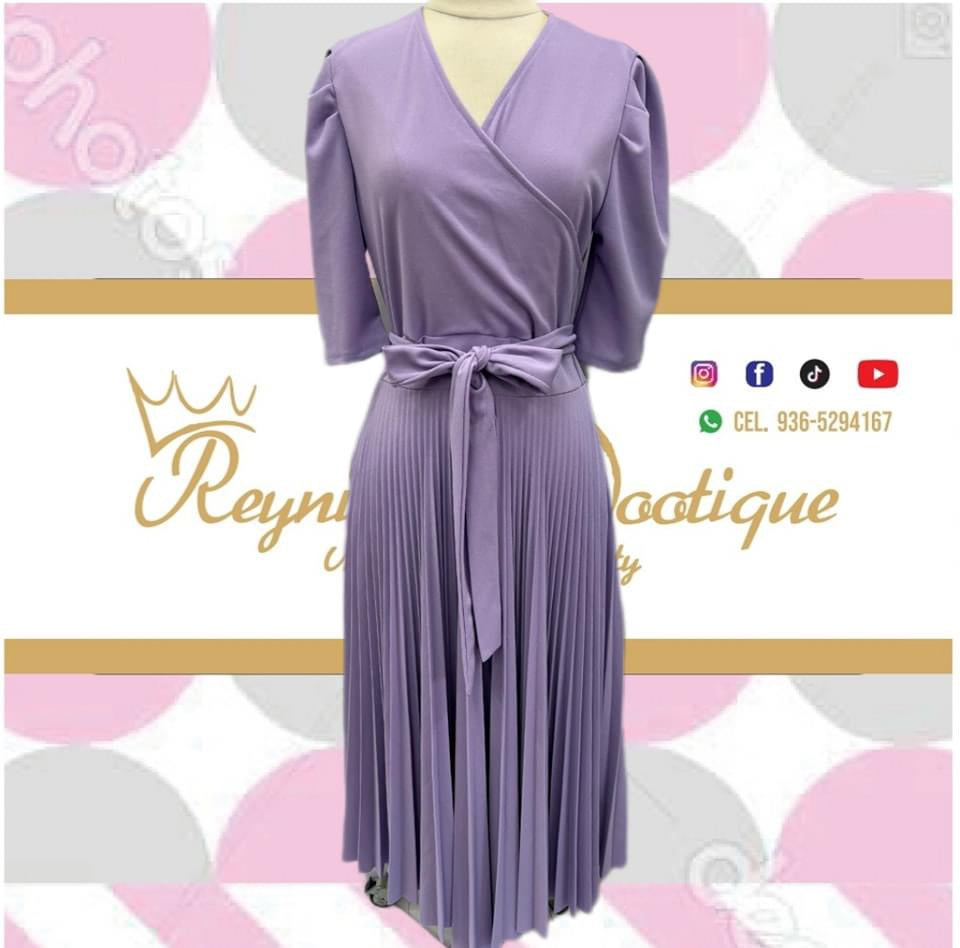 Este elegante vestido traslapado plisado es perfecto para cualquier ocasión. Cuenta con bolsillos para mayor comodidad y un listón que resalta tu cintura. Su diseño de manga hasta el codo te mantendrá fresca y cómoda todo el día. Completa tu look con este disco completo.